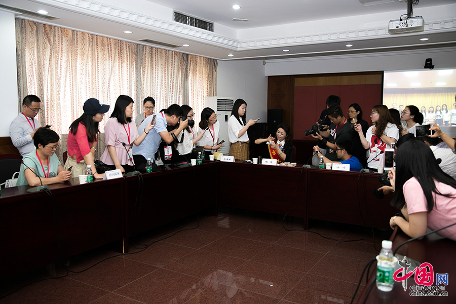 陶萍向现场记者介绍快速辨识假币的方法。中国网记者 董宁摄影