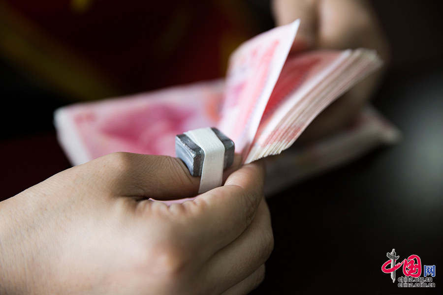 ??? 点钞机数一百张钞票大概需要5到6秒钟,中国人民银行南京支行的陶萍用多指点钞只需要4秒钟。凭借一手让人眼花缭乱的点钞技巧,陶萍在前一段热播的反腐大剧《人民的名义》中也客串了一把,她在剧中本色出演银行工作人员,现场清点国家部委某司的处级干部赵德汉受贿两亿赃款,短短20秒左右的点钞片段让观众直呼过瘾。中国网记者 董宁摄影