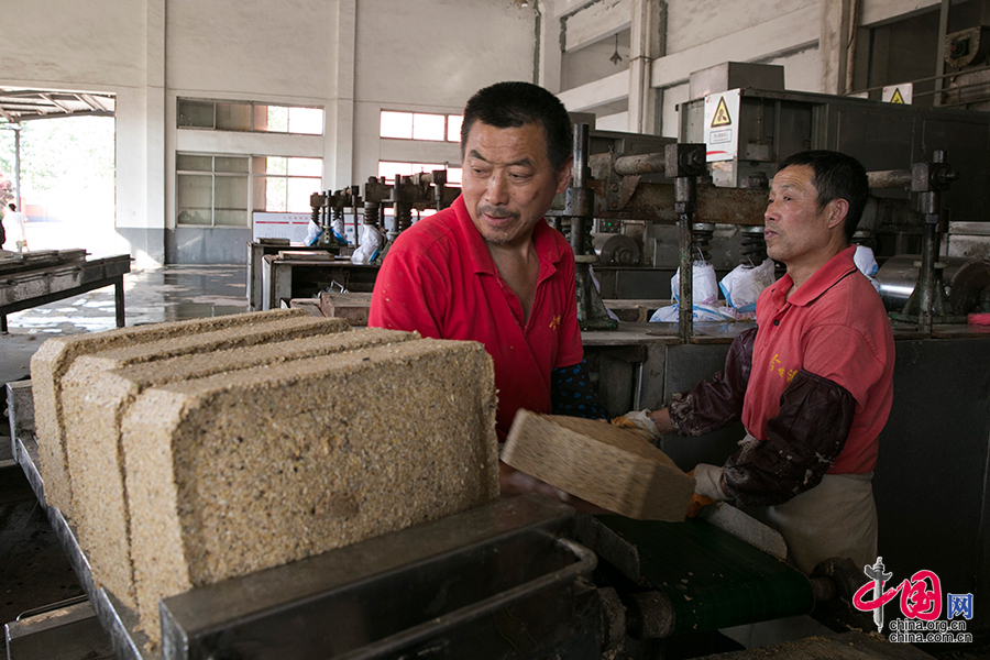 2006年,吴建峰牵头组织开展的“国缘酒酿造工艺创新研究”项目获得淮安市重大科技成果奖,该成果的应用从酿酒工艺及原料上予以改进,推动了6000吨酿酒技改项目的实施。酒曲酿酒是中国酿酒的精华所在。压制成的曲块在高温下产生霉菌,形成酒曲。中国网记者 董宁摄影