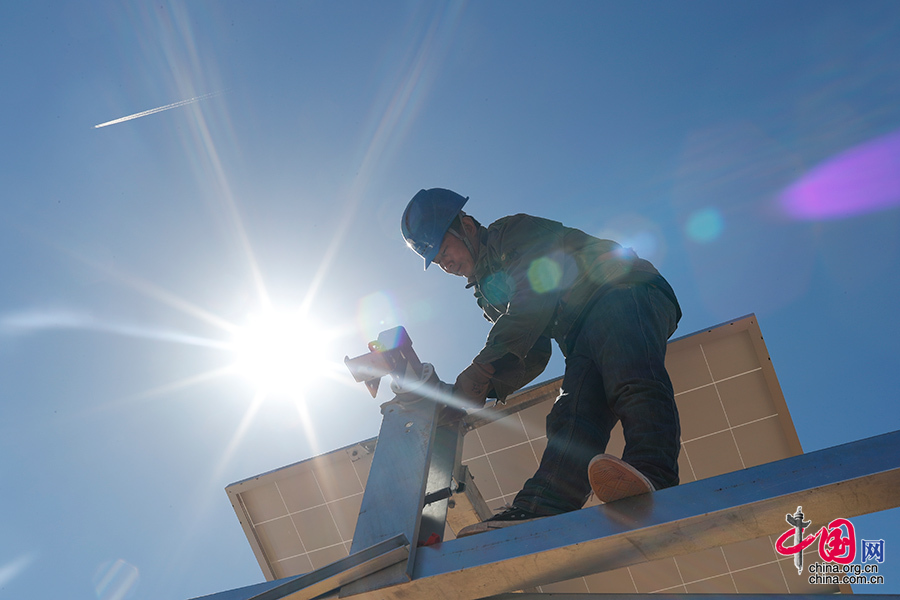 来自赤峰的张白喜带着蓝色的安全帽,手拿电批站在铁架上,等着开工程车辆的同事吊运来光伏发电板。他刚来这里几天的时间,负责装配光伏板,一个小组5-6个人,一天能安装两三百块。张白喜安装的太阳能板4个一组,每片呈长方形,面积1平方米左右,板子下面连着输出线缆,每组板子由一个电机控制,随着日光转动。中国网 杨佳 摄影报道
