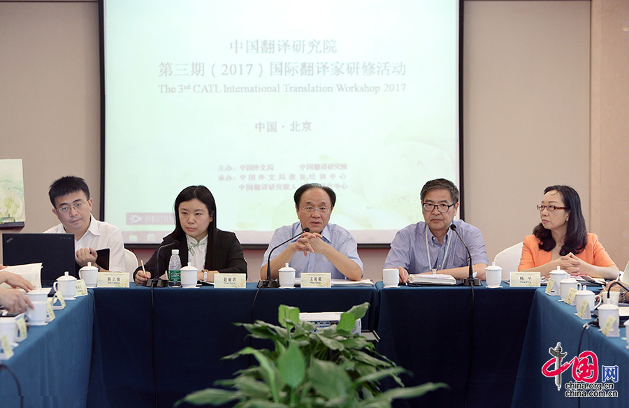 中国网讯(记者 杨佳)7月13日,中国翻译研究院第三期(2017)国际翻译家研修活动在北京开幕,来自美国、俄罗斯等国家的10位中文翻译家,与外交部、新华社、中央编译局和中国外文局以及今日俄罗斯国际通讯社北京分社的资深翻译专家,以及来自中央党校、国家发改委的政策研究专家共同研讨,聚焦党政文件中译英、中译俄的对外译写和传播,探寻中国政治文献的最佳外文呈现和国际表达,展开为期4天的高级别跨文化深度对话和思想碰撞。