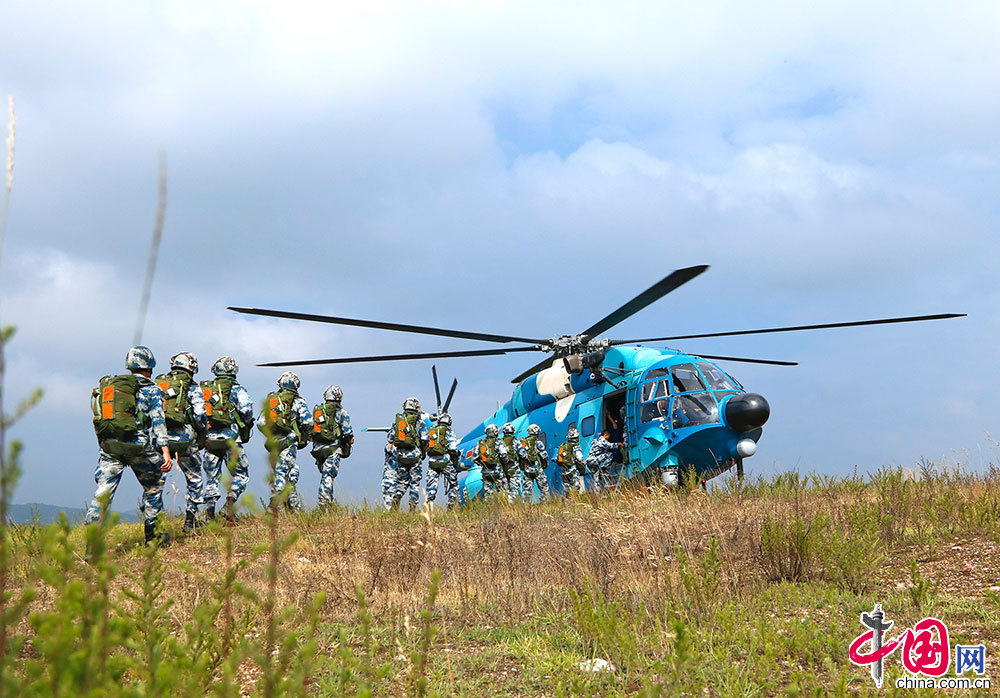 6月12日,空降兵演练期间队员登上战鹰。 孙泽宾摄影