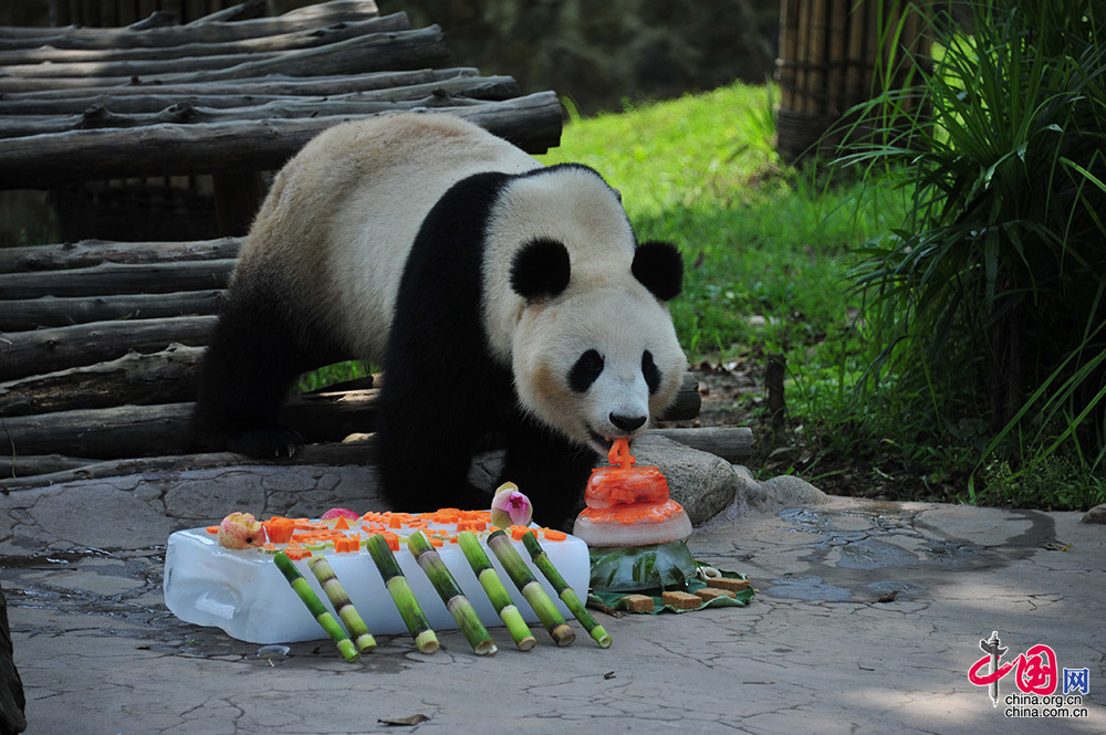 中国网讯 8月14日,中国大熊猫保护研究中心海归大熊猫“福豹”在都江堰青城山基地蝶泉园迎来它的四岁生日,这也是它回国后度过的第二个生日。