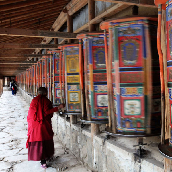在甘肃省甘南藏族自治州拉卜楞寺内,藏民在转经筒。袁纯刚 摄