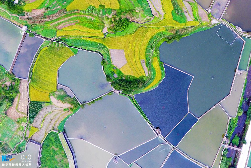 立秋之后,南方水稻逐渐成熟,金黄色的稻田呈现出别样美景。在重庆市万盛经开区南桐镇金龙村,金黄色稻田与鱼塘相互映衬,田野的线条在稻田中穿梭,美不胜收。从空中俯瞰,犹如天然“调色板”,色彩斑斓。新华网发曹永龙摄