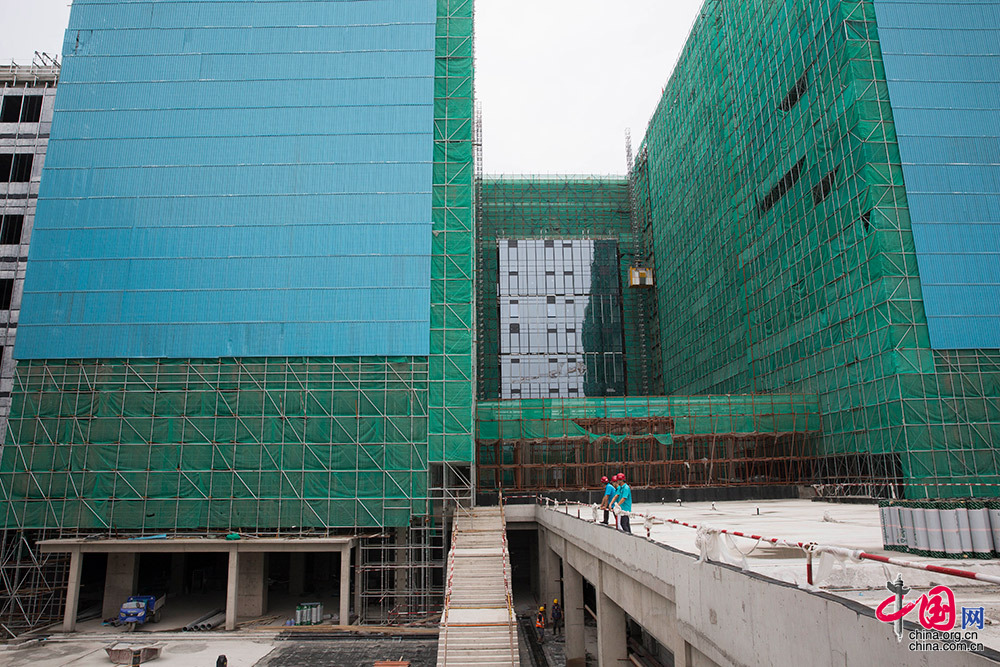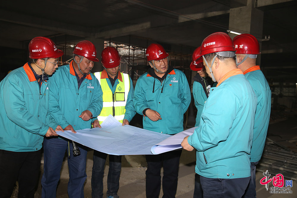每天中午,宁卫东都会到工地转一圈,确认工程进度,检查施工情况。A1工程建筑面积31.9万㎡,东西长900米,南北宽360米,2017年的夏天酷热难耐,一圈转下来,需要半个多小时,他每天至少要转3、4圈。中国网记者董宁摄
