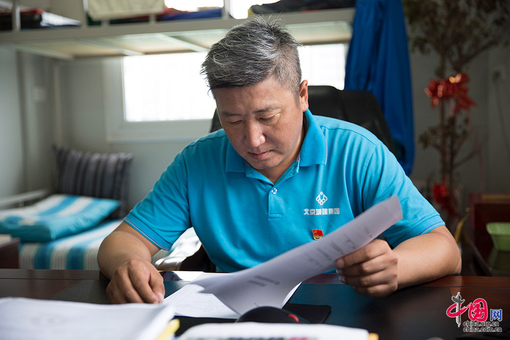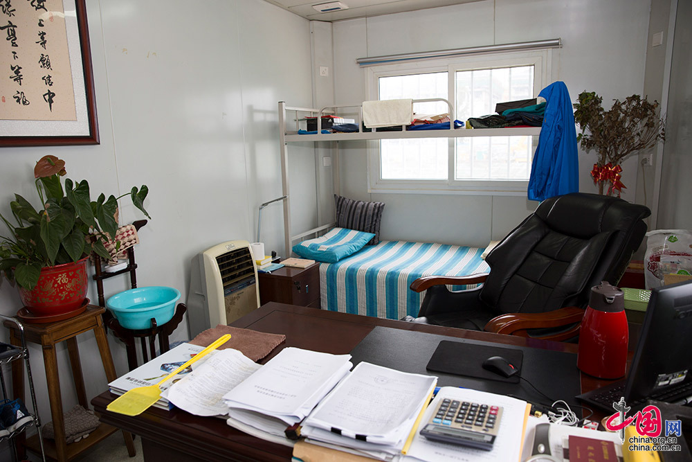 在项目部临时搭建的简易房中,有一间宁卫东的办公室,里面有一张单人床,虽然宁卫东的家就在北京,可是他一直坚持吃住在工地上,2016年和2017年连续两年春节,宁卫东都坚守在工作岗位上。中国网记者 董宁摄