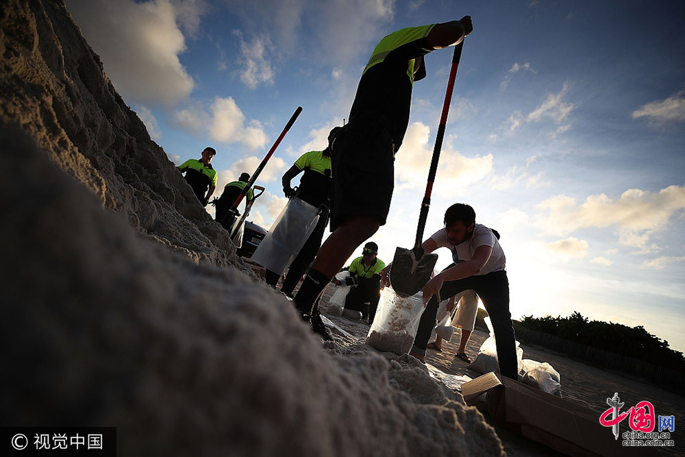 当地时间2017年9月7日,美国佛罗里达迈阿密海滩,美国民众迎战飓风"艾尔玛"填沙袋。视觉中国