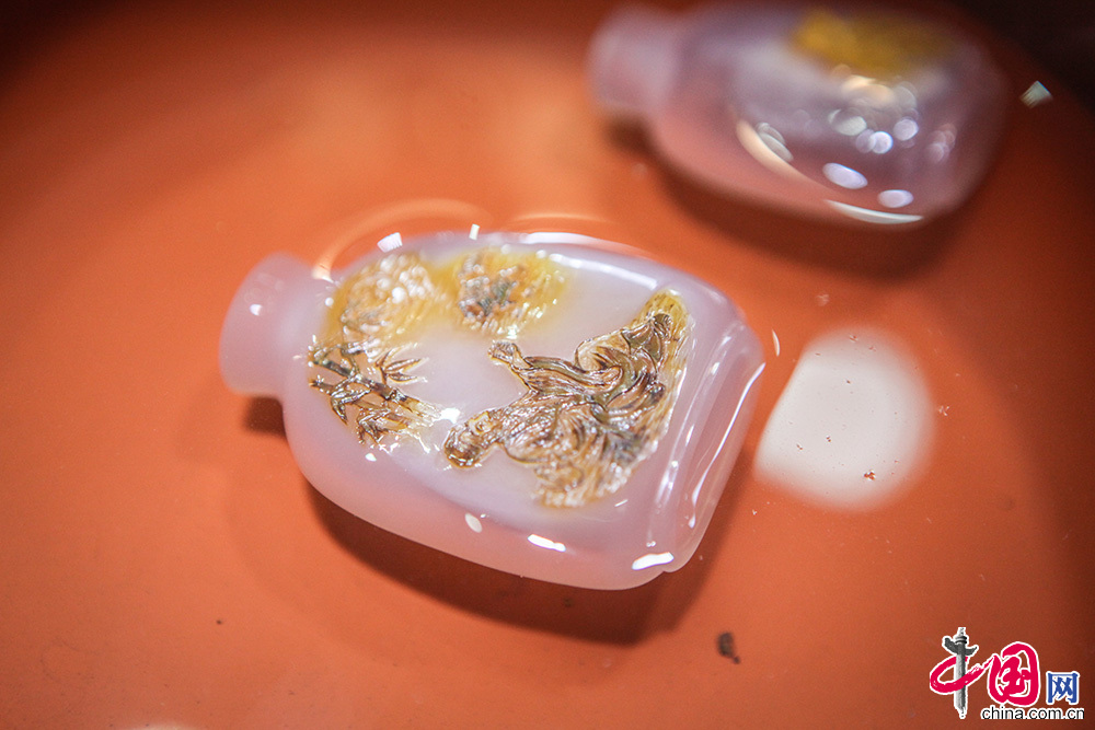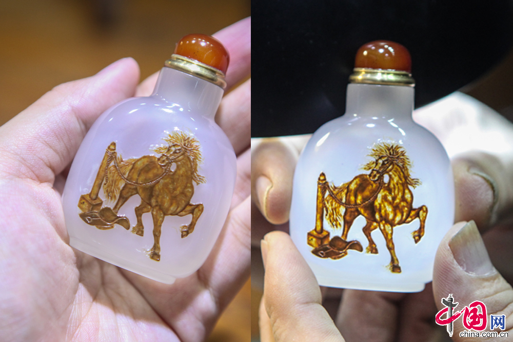 除了内容创新,李克生也在技艺上不断创新。鼻烟壶的图案在灯光下变得栩栩如生,富有立体感。中国网记者 伦晓璇 摄