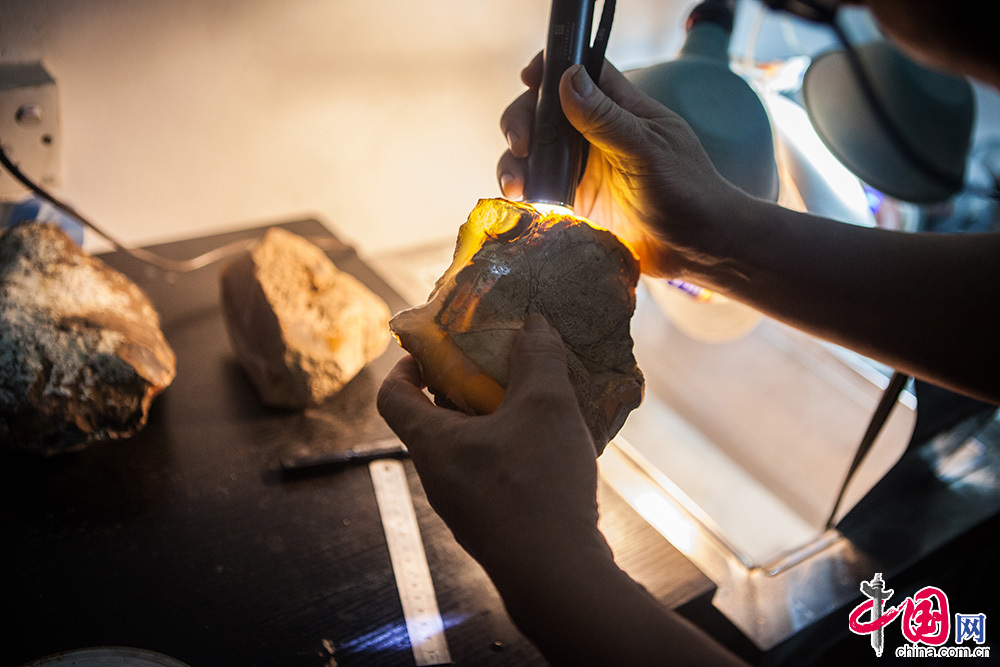 拿到一块玉石材料后,要根据成色和完整度等判断是否适合制作鼻烟壶,再画出轮廓。如果在切割后发现里面有裂痕,那选料就是失败的。因此要先了解透玉石,这在热爱玉石的李克生眼中,就是“与玉石交流、交心”。