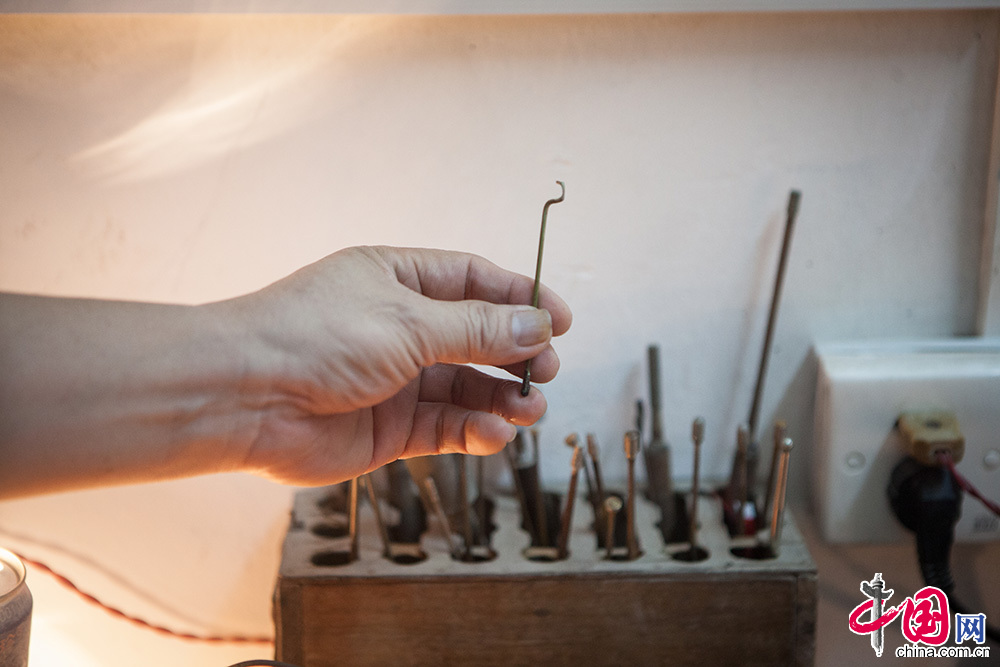 李克生展示了他进行掏膛的工具:一根头部弯曲的掏针。掏针的硬度要适中,太硬无法调节弯曲角度,太软则无法着力。掏膛时,要先挖一个小孔,然后用工具一点点掏空膛内,还要及时调整力度和弯曲角度。