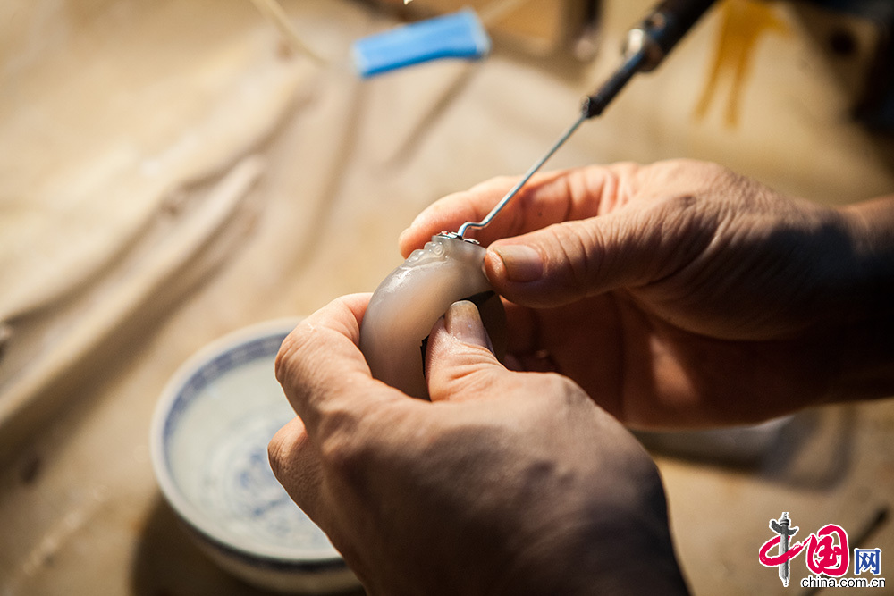 制作一个能够“水上漂”的鼻烟壶,大约需要选料、切料、打胚、掏膛、设计、雕刻等几项工序。