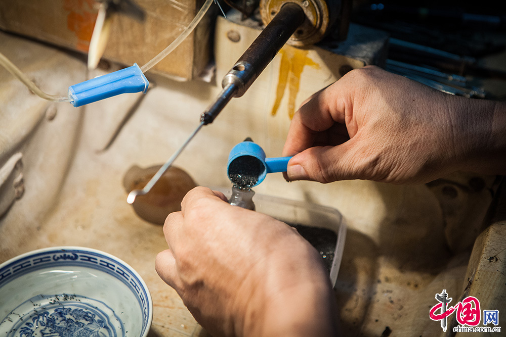 掏膛时,要先挖一个小孔,然后用工具一点点掏空膛内,还要及时调整力度和弯曲角度。中国网记者 伦晓璇 摄