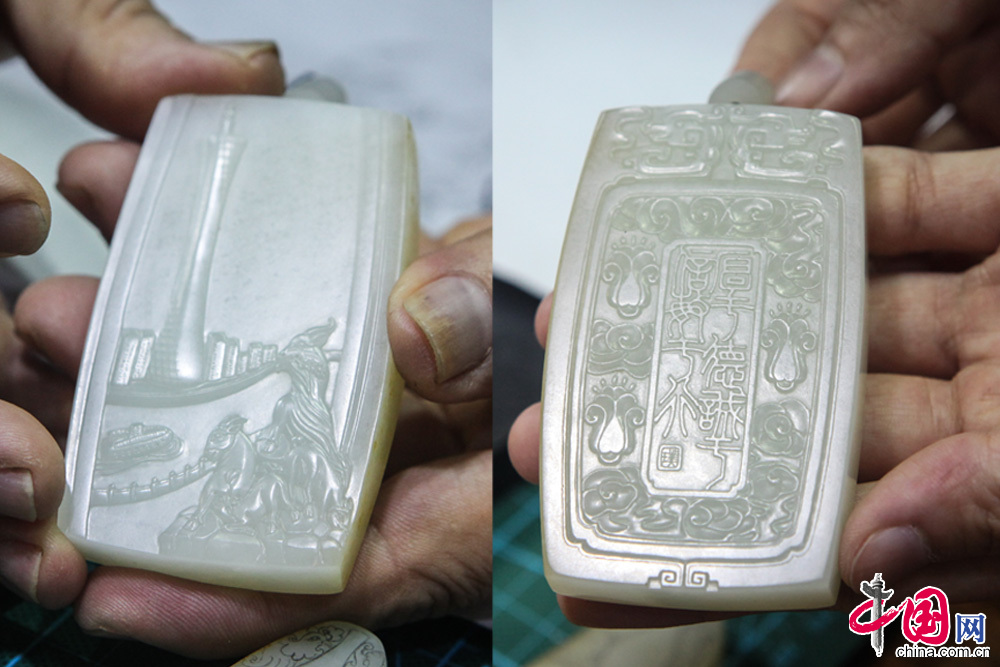 李克生在传承传统鼻烟壶制作的同时,与时俱进创作了很多传统与现代结合的作品。在这块名为《羊城?印象》的玉牌上,珠江分隔两岸,一侧是象征羊城历史文化的五羊雕像,一侧是象征广州蓬勃发展新貌的广州塔,作品背面则在玉雕中传统的“子冈牌”上巧妙雕刻广州市花——木棉花。中国网记者 伦晓璇 摄