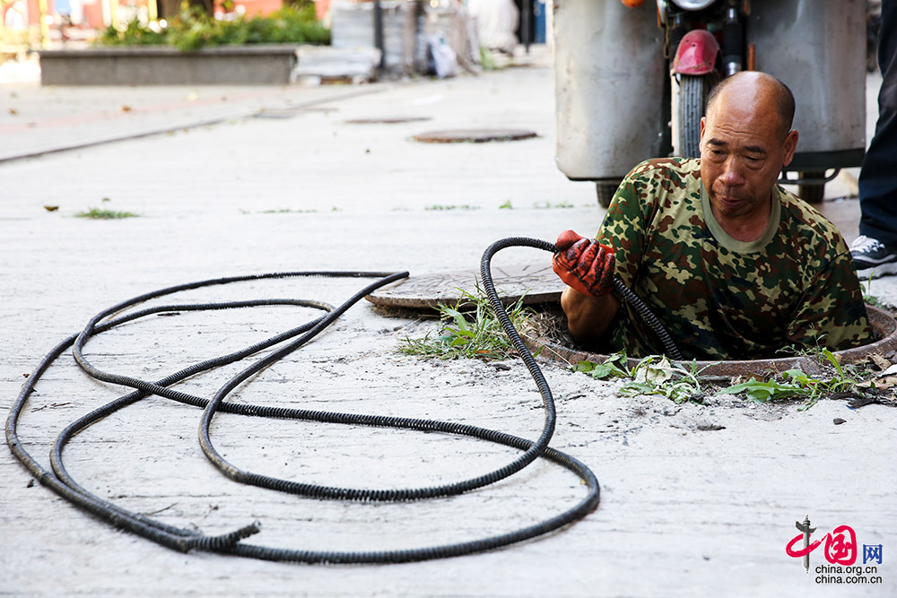 为确保王大爷家下水道彻底畅通,张喜忠在当日下午把清污水车开到了小区,用高压水枪对小区地下管道进行了彻底清理。中国网记者 董宁 摄影