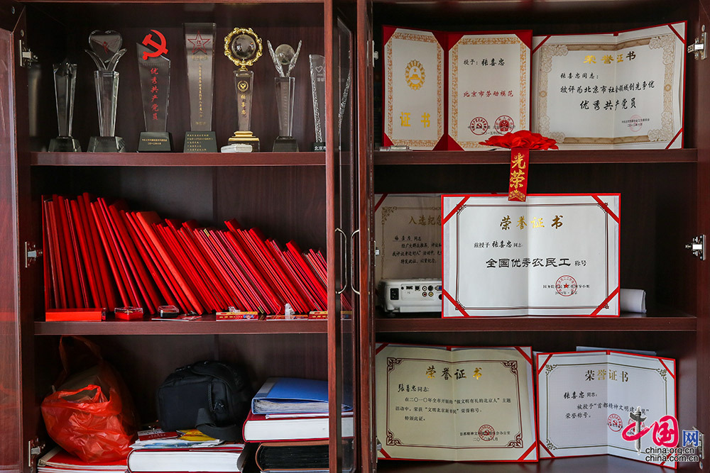 在张喜忠办公室的两个文件柜中,摆满了他和团队在这十几年来获得的各项荣誉证书及奖杯,包括优秀党组织、学雷锋标兵团队、优秀共产党员等众多荣誉。其中,《全国优秀农民工》称号的荣誉证书,摆放在最显眼的位置。中国网记者 董宁 摄影