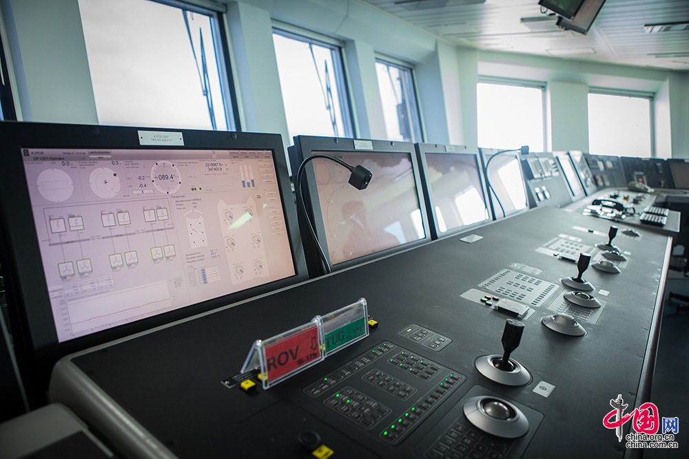 “兴旺号”有很多精准的传感器,能实时感知水流、风速、风向、平台纵摇横摇上下升沉的变化,它还拥有精确的卫星及声纳位置参考系统动力定位系统,通过分析传感器及系统提供的数据对推进器的推力和方向进行调整,确保平台定位在指定位置。中国网记者 伦晓璇 摄