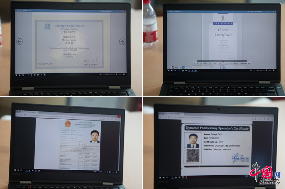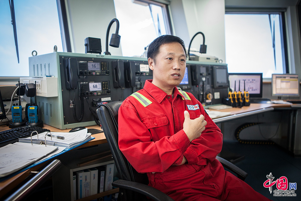 盖凤喜是国内较早持有并从事动力定位作业人员之一。在此之前,国内海工领域的所需的动力定位人员只能高价从国外聘请。1993年,盖凤喜从大连海事大学毕业,实现了自己的航海梦,随远洋油轮,穿梭于世界各大洋中。上世纪末,拥有动力定位技术的海洋装备在世界各地开始出现。对于航海科技有着强烈好奇心的盖凤喜,抓住机会通过外籍船东的面试,投入到这一领域,在国外完成动力定位及相关培训课程,并取得英国航海家协会颁发的动力定位证书,开始了连续10年的动力定位船舶和钻井平台的技术积累。中国网记者 伦晓璇 摄