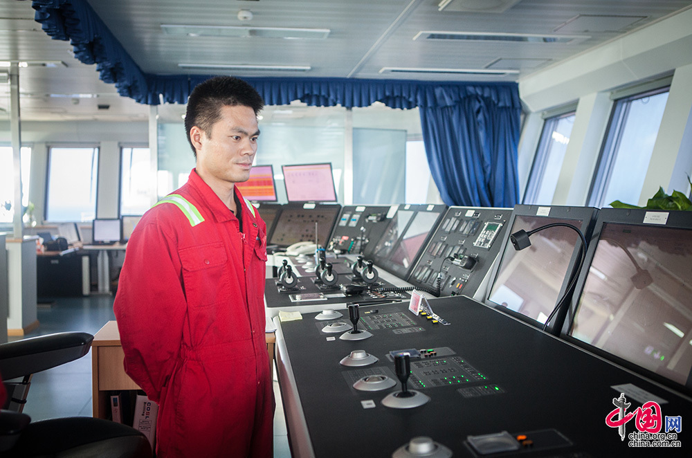 ??? 越是高精尖的设备对操作者的技术要求就越高。作为高级定位师,他们负责掌控动力定位系统,确保船舶“纹丝不动”。此外,在平台航行、移位过程中,定位师还负责制定具体航线。他们不仅需要密切关注设备的运行,还需注意气象和海况的变化,其中台风就是作业的最大风险之一,因为平台移动速度慢,有时还悬挂隔水管,不可能驶离太远,定位师的操作直接关系到整个平台船体结构的安全及人员安全。中国网记者 伦晓璇 摄