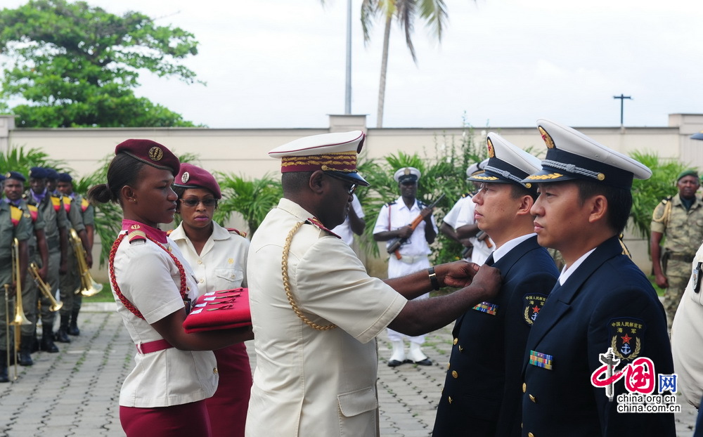 10月6日,加蓬国防部举行了隆重授勋仪式,向在加中交流合作中做出杰出贡献的11名任务官兵授予荣誉勋章。我非常荣幸获得了加蓬国家医疗服务银质勋章,还受到了加蓬总统邦戈的亲切接见。加蓬总统邦戈以加蓬人民的名义高度评价医院船为加蓬民众提供的免费诊疗服务!刘洋摄