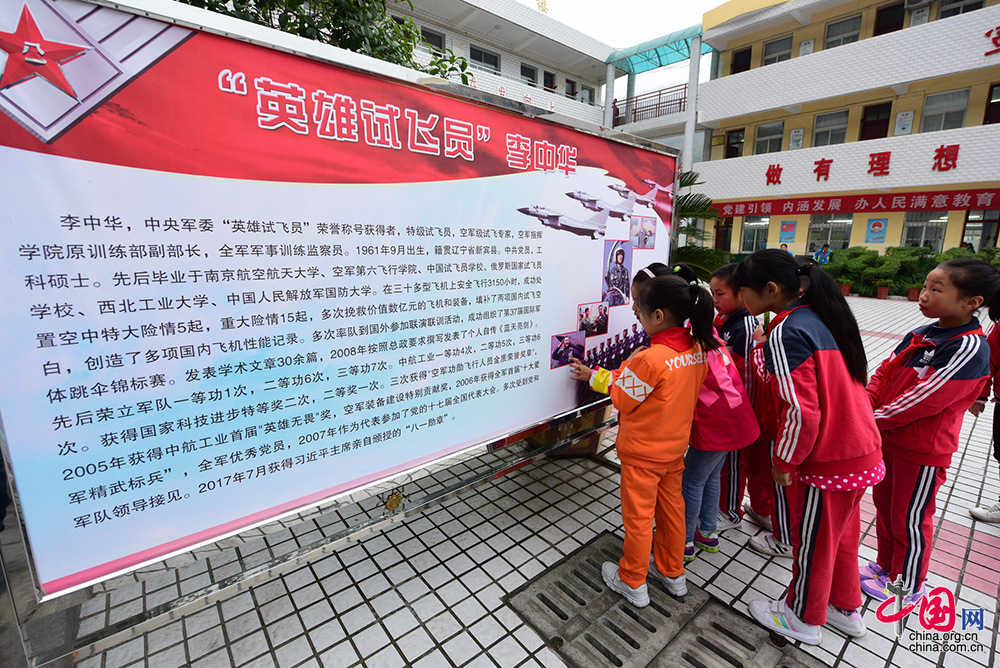 山区的孩子们围在李中华的事迹前,好奇的数着英雄得过军功章的数量。 中国网发