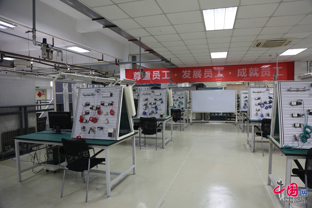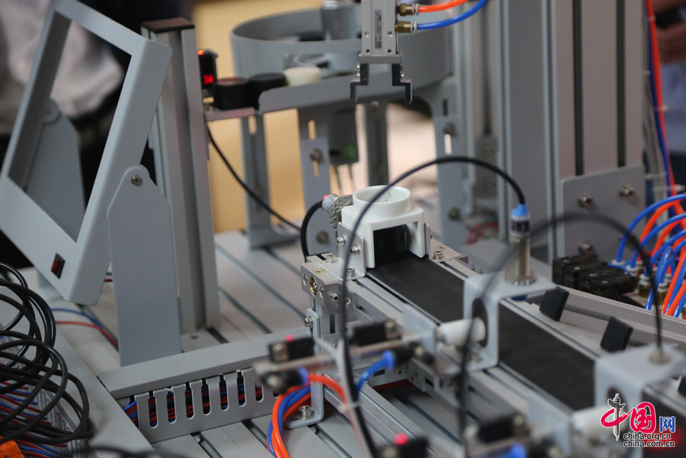 学员用来练习的光机电一体化实验装置,这是一个模拟机械手臂编程自动识别分拣系统,如果一个学员可以独立完成模拟机械手臂的编程,基本就达到了技师水平。 中国网 杨楠 摄影报道