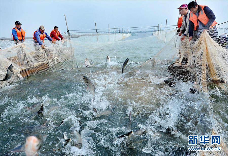 11月28日,渔民在江西省鄱阳县鄱阳湖内湖捕鱼。初冬时节,江西省鄱阳县鄱阳湖内湖水域中养殖的鱼类开始捕捞,一派鱼跃人欢的丰收景象。新华社发(卓忠伟摄)
