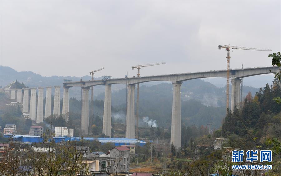 这是12月3日拍摄的黔张常铁路革勒车大桥施工现场。自2014年开工建设以来,横跨重庆、湖北、湖南的黔张常铁路建设工程进展顺利。黔张常铁路是渝长厦快速铁路的一部分,起于重庆黔江区,止于常德武陵区。该铁路建成后从重庆坐火车到长沙只需3个小时,比原先节省近7个小时。新华社发(杨顺丕摄)