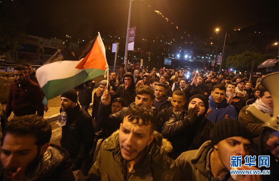 12月6日,巴勒斯坦人聚集在约旦河西岸城市纳布卢斯,抗议美国总统特朗普宣布承认耶路撒冷为以色列首都。美国总统特朗普6日宣布承认耶路撒冷为以色列首都,并将启动美驻以使馆从特拉维夫迁往耶路撒冷的进程。巴勒斯坦、约旦、埃及等中东地区国家以及阿拉伯国家联盟(阿盟)表示,美方此举可能引发“危险后果”。新华社发(艾曼摄)