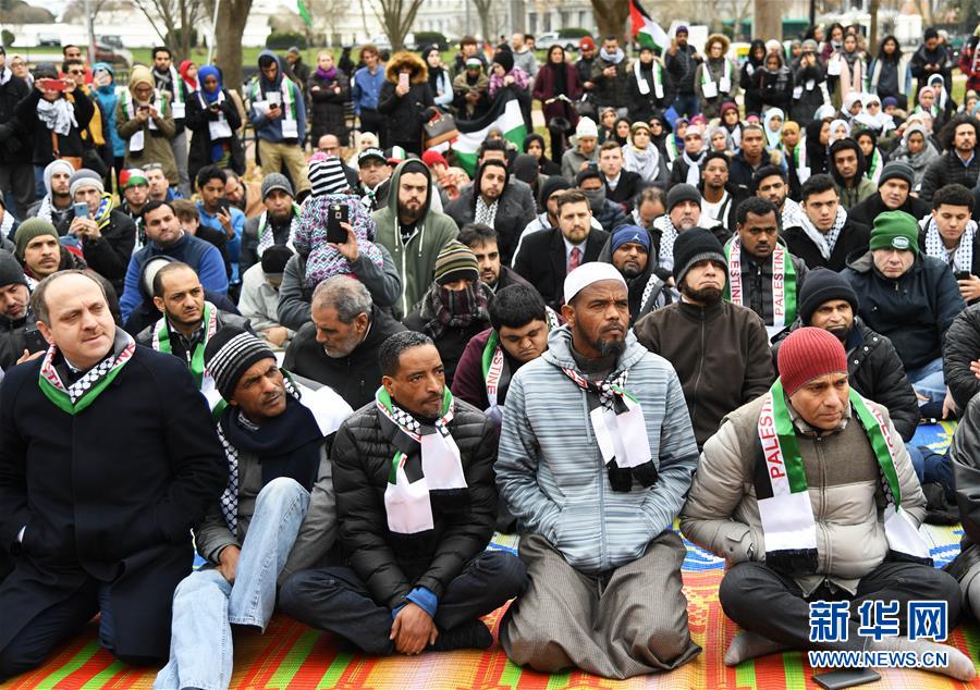 12月8日,穆斯林民众在美国华盛顿白宫北侧的拉斐特广场参加抗议。当日,数百名美国穆斯林民众在华盛顿举行集会,抗议总统特朗普6日宣布承认耶路撒冷为以色列首都。新华社记者 殷博古 摄
