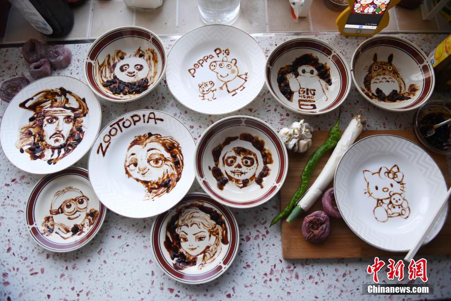 李小花在长春的家中用黄豆酱和老抽做颜料,用勺子、筷子做画笔,用盘子做画板,描绘出可爱的卡通图案。据她讲,创作“盘中画”的原因,是为让三岁的儿子爱上吃饭。中新社记者张瑶 摄