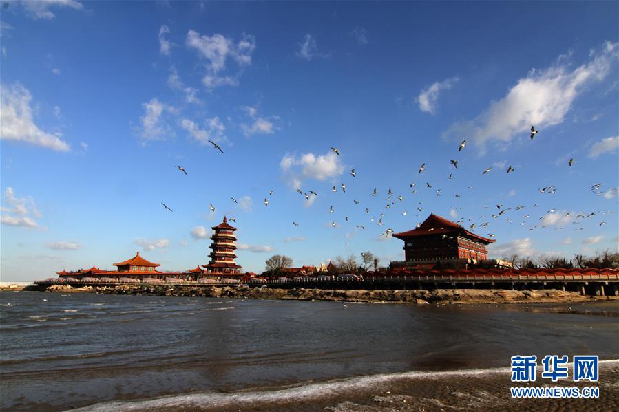 12月17日,一群海鸥在山东蓬莱市八仙过海景区附近飞翔。当日,山东蓬莱市天气晴好,景区古建筑在蓝天白云映衬下别有韵味。新华社发(于良意 摄)