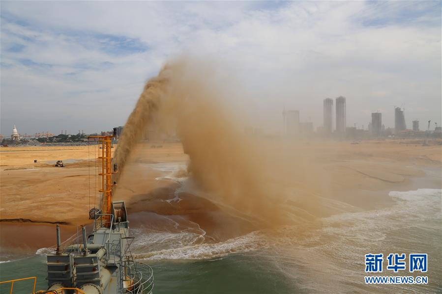 12月16日,在斯里兰卡科伦坡港口城项目施工现场,“万顷沙”号耙吸吹沙船正在吹沙。斯里兰卡首都科伦坡的港口城施工现场一派繁忙,三艘从中国远道而来的耙吸吹沙船正在夜以继日将科伦坡港口城变为现实。记者16日登上了其中的“万顷沙”号,一探这填海造地“神器”。新华社记者朱瑞卿摄