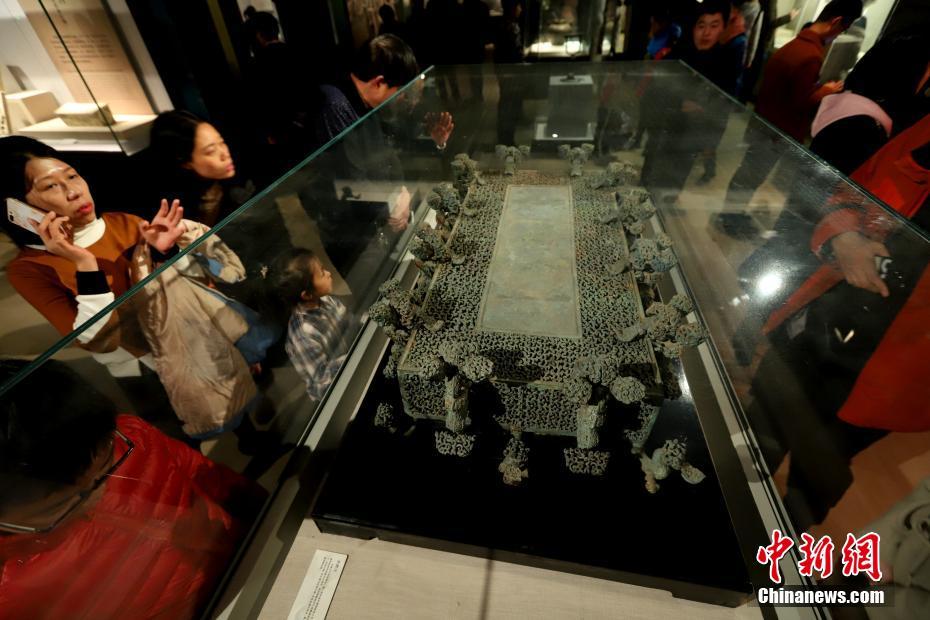 12月17日,由于媒体提前对贾湖骨笛、妇好鸮尊、云纹铜禁将登陆中央电视台《国家宝藏》的预告宣传,民众寒风里在位于郑州的河南博物院外排长队等候一睹国宝风采。图为禁止出国(境)展览文物之一云纹铜禁。中新社记者 王中举 摄