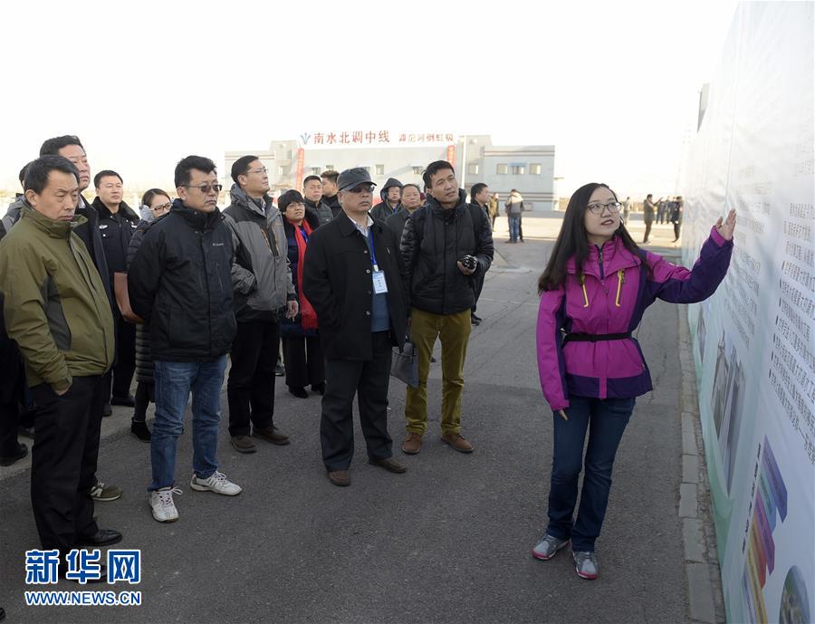 12月18日,在位于河北省正定县境内的南水北调中线滹沱河倒虹吸工程现场,参加开放日活动的嘉宾听取工作人员介绍情况。当日,“南水北调中线工程通水三周年开放日”活动在南水北调中线建管局河北分局辖区内的滹沱河倒虹吸工程现场举行。来自社会各界的公众代表实地参观走访南水北调工程,了解工程建设和管理情况,感受通水三年来产生的社会和生态效益。据介绍,南水北调中线工程于2014年12月12日建成通水,截至2017年12月12日,中线工程不间断通水,累计向北方供水达108亿立方米,改善了群众生活,促进了企业发展,为沿线地区经济社会发展提供有力支撑。新华社记者鲁鹏 摄