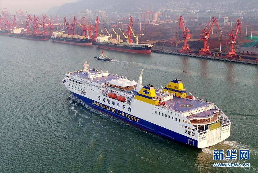 12月18日,大型豪华客滚船“和谐云港”号从江苏连云港启航开往韩国仁川。当日,江苏连云港港口集团的大型豪华客滚船“和谐云港”号在连云港港投入运营,开启连云港至韩国仁川的首航之旅。该船总长196米、宽28.6米、总吨位为3.4万吨,乘客定额为1080人,车道长度2480米,船上还设有超市、免税店、酒吧、棋牌室、包厢影院等娱乐休闲设施。新华社发王健民 摄