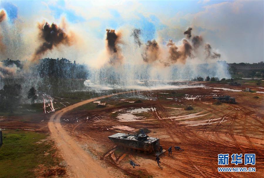 在“海上联合-2016”军事演习中,中俄海军陆战队混编陆战分队对岛礁防御之“敌”发起进攻(2016年9月14日摄)。