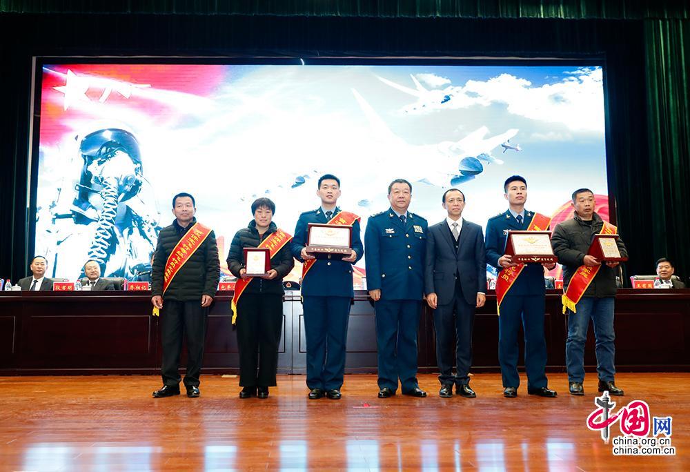 图为首次评定飞行等级的飞行员及家庭代表分别颁发“首次评定飞行等级纪念”牌、“空军飞行员光荣家庭”荣誉匾。 中国网记者 杨佳摄影