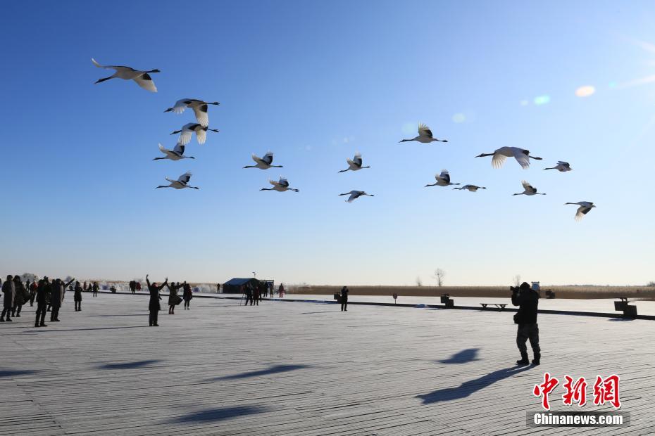 12月26日,数九寒冬,皑皑白雪覆盖了扎龙自然保护区。在扎龙湖观鸟旅游区,游客们欣赏壮丽的塞北冬季湿地景观时,近百只身着黑白羽衣的丹顶鹤飘然起飞,在空中盘旋着高歌起舞,雪地观鹤游再次成为黑龙江省冬季旅游的黄金线路。扎龙国家级自然保护区是中国最大、世界闻名的扎龙湿地,位于黑龙江省齐齐哈尔市东南30千米处。总面积21万公顷,为亚洲第一、世界第四,也是世界最大的芦苇湿地,是中国首个国家级自然保护区,被列入中国首批“世界重要湿地名录”。图为群鹤放飞表演。 中新社记者 于琨 摄
