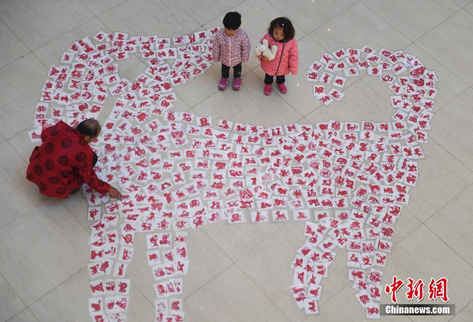 12月26日,济南民间剪纸艺人用数百只形态各异的剪纸“狗”拼“瑞狗迎新”图。图为济南67岁剪纸艺人徐建剪2018只“旺旺狗”迎新年。 中新社记者 张勇 摄