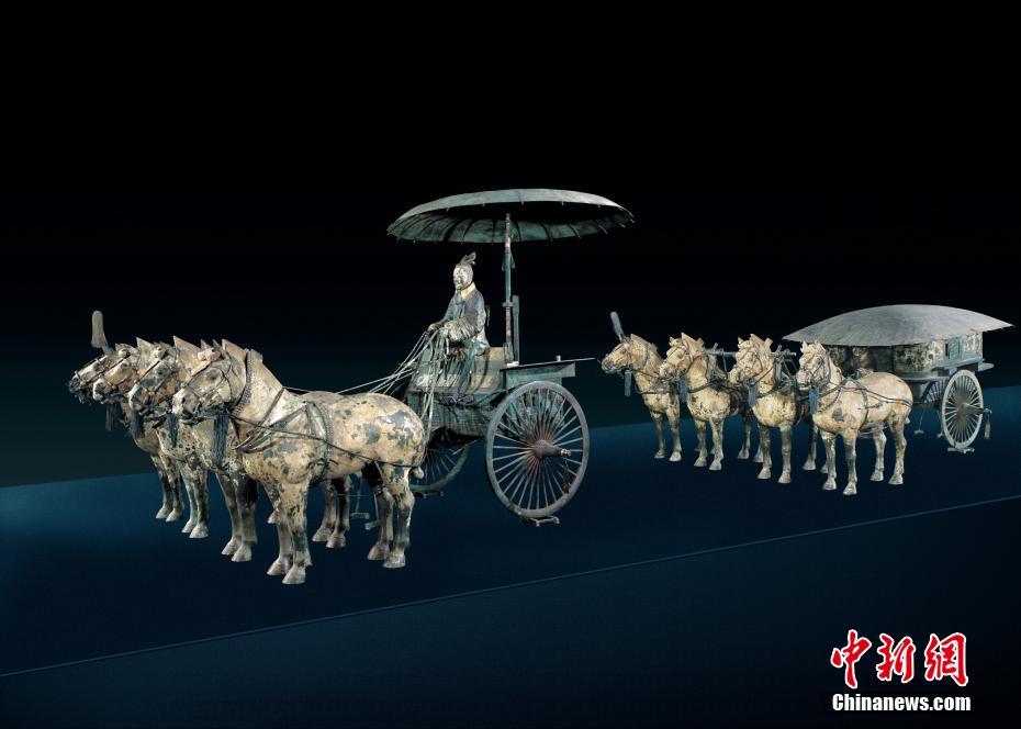 12月28日,秦始皇帝陵铜车马博物馆建设开工仪式在秦始皇帝陵博物院·丽山园举行。博物馆选址于秦始皇陵封土西南侧,建筑面积约8000平方米,为地下一层(下部设夹层)、屋面覆土绿化建筑,计划总投资1.895亿元,计划建设期限为2017年12月至2019年10月。图为铜车马。 中新社记者 钟欣 摄