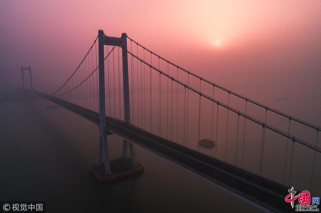 2018年1月1日清晨,一轮红日在江苏泰州长江大桥上空冉冉升起。图片作者:汤德宏/视觉中国