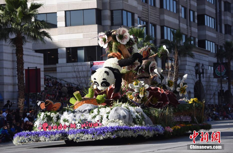 当地时间2018年1月1日上午,第129届美国玫瑰花车游行在加利福尼亚州名城帕萨迪纳市盛大登场。久负盛名的美国玫瑰花车游行已有逾百年历史,与纽约时代广场新年倒计时活动齐名,是美国规模最大、吸引观众最多的新年庆典之一。在众多形态主题各异的缤纷花车中,几辆凸显“中国元素”的花车备受瞩目。图为一辆以中国“国宝”大熊猫造型为主题的花车。 中新社记者 张朔 摄