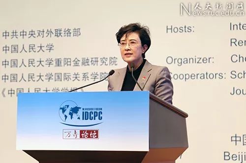 2017年12月3日,中国人民大学与中共中央对外联络部联合主办“中国共产党与世界对话会”之万寿论坛,聚焦习近平新时代中国特色社会主义思想的世界意义。图为中国人民大学党委书记靳诺在致辞。(来源:人大新闻网)