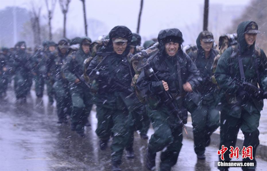 1月3日,武警湖北省总队率机动支队开展覆盖全省域的冬季野营拉练。此次拉练分鄂东、鄂西北两个方向,在4天的时间里,武警官兵将走进三峡坝区、大别山腹地等复杂地域,开展五公里武装奔袭、战斗警戒、疏散隐蔽、战场救护等基础课目训练及山林地捕歼战斗对抗演练、楼房反劫持对抗演练、端黑窝点对抗演练等重难点课目训练。2日以来,湖北遭遇入冬以来强度最大、范围最广的持续雨雪天气,拉练官兵们顶风冒雪,在严寒天气中锤炼实战能力和军事作风。 谢定安 摄