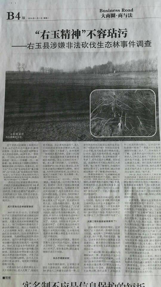 据中国联合商报记者周磊山西报道位于晋西北边陲黄土高原的右玉县,由于近代生态环境恶劣,解放初期第一任县委书记就开始带领全县人民治沙造林。60多年来,一张蓝图、一个目标,19任县委书记和县委、县政府一班人,一任接着一任、一届接着一届,率领全县干部群众坚持不懈植树造林,防风固沙,改善生态。右玉从“不毛之地”变成现在的“塞上绿洲”;从“沙进人退”变成现在的“绿色生态”;从不适宜人类生存的大风口变成现在的最佳宜居生态县,锻造出被人们称道的“右玉精神”。然而近日记者接到群众举报,反映右玉县威远镇威远村有350多亩生长了40多年的人工林惨遭非法砍伐,当地生态遭到严重破坏,一旦刮风就尘沙飞扬,百姓苦不堪言。本报记者第一时间赶赴右玉进行实地采访。成片原始生态林被毁惨状12月12日,记者来到位于右玉县城西部的威远镇威远村李家湾,看到这里成片原始生态林被毁,大量光秃秃的树根裸露于地表之上,专门为毁林而修建的石子路依然清晰可见。