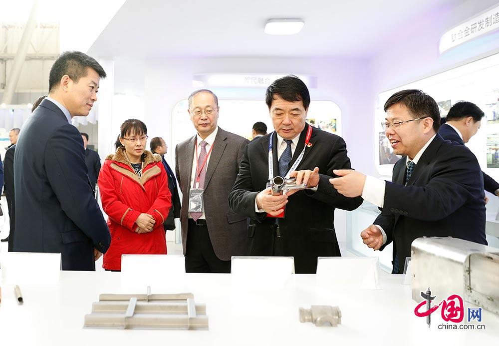 黑龙江省副省长胡亚枫在中国航天科工集团有限公司副总经理魏毅寅、中国航天科工三院院长张红文的陪同下,参观航天科工展台。中国网 杨佳摄影