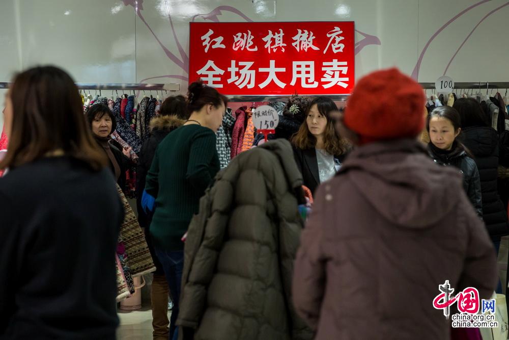 北辰购物中心还在营业的摊位上基本都可以看见这种醒目的打折招牌,平时上千元的服装,现在一两百元就可以买到。中国网记者 郑亮摄