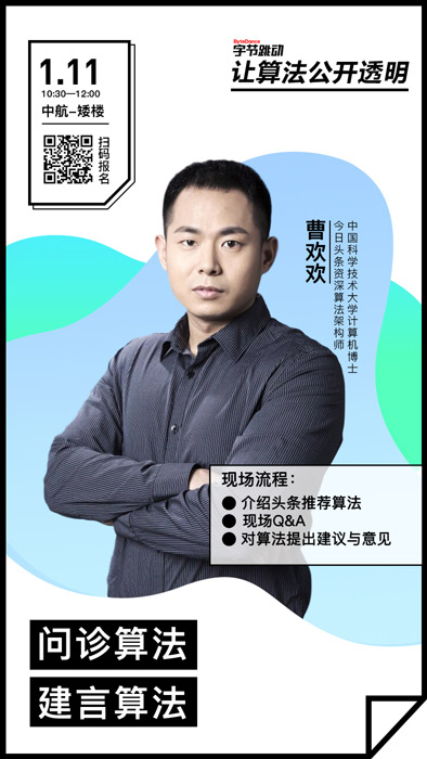 海报上的信息显示,1月11日(本周四),今日头条资深算法架构师,中国科学技术大学计算机博士曹欢欢,将带来题为《让算法公开透明》的分享,揭秘今日头条推荐算法。同时,将在现场解答社会各界人士对算法的疑问,并接受建言,以改善算法更好的为用户服务。