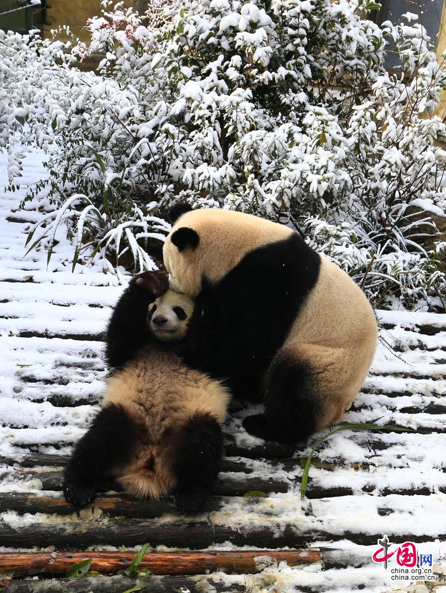 瑞雪兆丰年,2018年1月8日凌晨,第一场瑞雪降临都江堰,成都大熊猫繁育研究基地都江堰繁育野放研究中心——中华熊猫谷银装素裹,美不胜收。这对地处盆地、极少见雪的成都平原来说可谓是新年的一份大贺礼。喜欢在湿冷天地里生活的可爱大熊猫们也和大家一样喜欢这份惊喜,在熊猫谷的雪地里尽情打滚撒欢,玩得不亦乐乎。